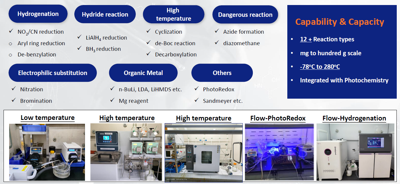 Bioduroではカスタムメイドシステムにおける専門的なノウハウにより、フローケミストリーにて多くの反応タイプに適応可能