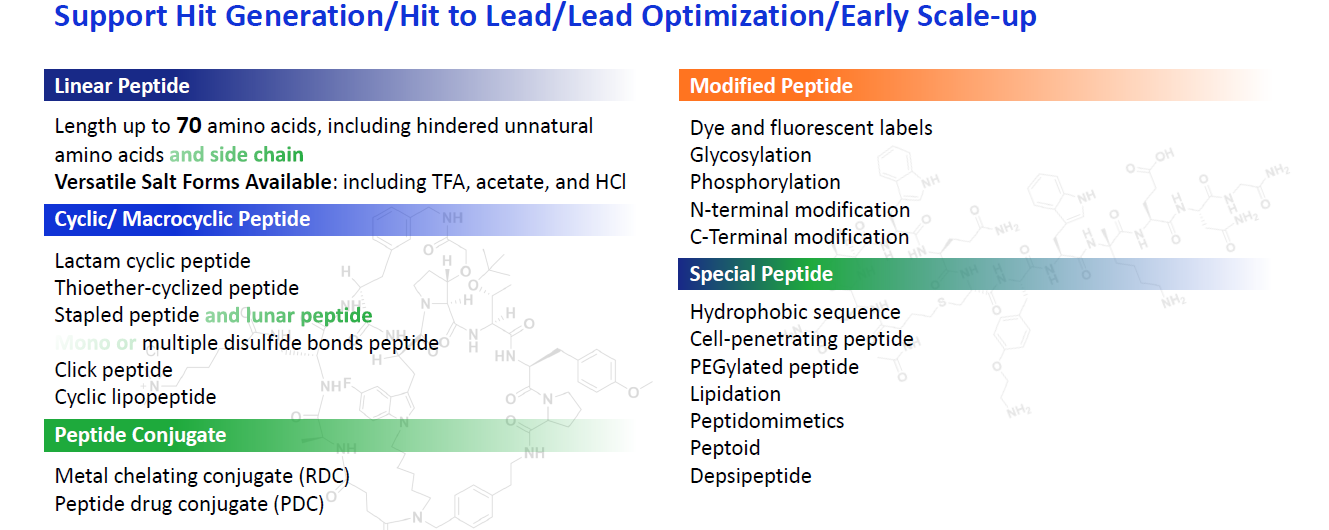 BioDuroでは、ペプチド化学における数十年にわたる経験と専門知識を活用し、ミリグラムからグラムスケールまで高品質のペプチドを提供しています。北京にある専用の1,500 m²ペプチド合成センターを含む当社の最先端の施設には、トップクラスの機器が装備されており、100 人以上の経験豊富な化学者チームによってサポートしています。Bioduroでは線状ペプチド、環状ペプチド、修飾ペプチド、共役ペプチドなど様々なペプチドカタログを合成対応可能です。