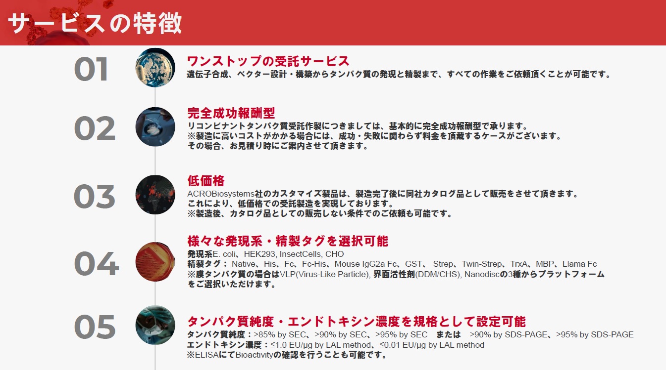 カタログ品からご希望の製品が見つからない場合はACROBiosystems社のカスタマイズサービスをご利用ください。同社のテクノロジープラットフォームを活用してお客様の研究をサポートいたします。